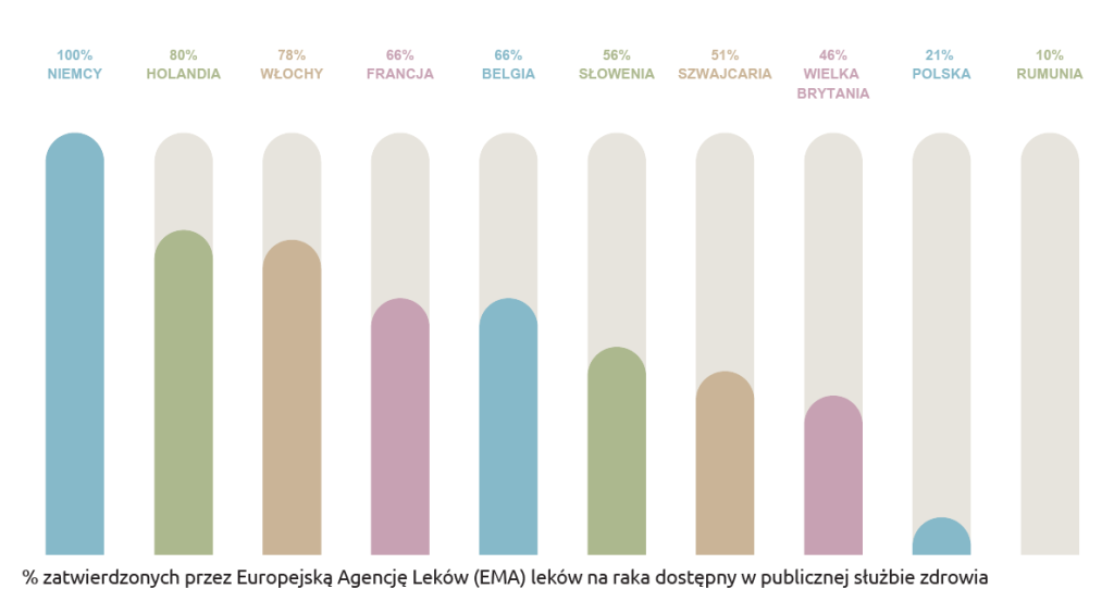 Poniżej prezentujmy dane pokazujące % zatwierdzonych przez Europejską Agencję Leków (EMA) leków na raka dostępny w publicznej służbie zdrowia: